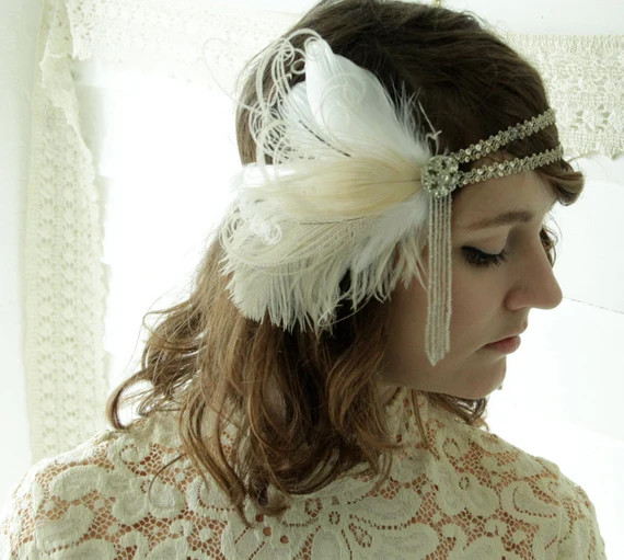 The bride shares about a last-minute detail: I wanted to do something with a vintage milk glass bracelet I had, and I imagined a gorgeous headpiece! My maid of honor, Meghan, assembled the bracelet with gold chains — the day of— while all of us were getting our hair done at the salon.